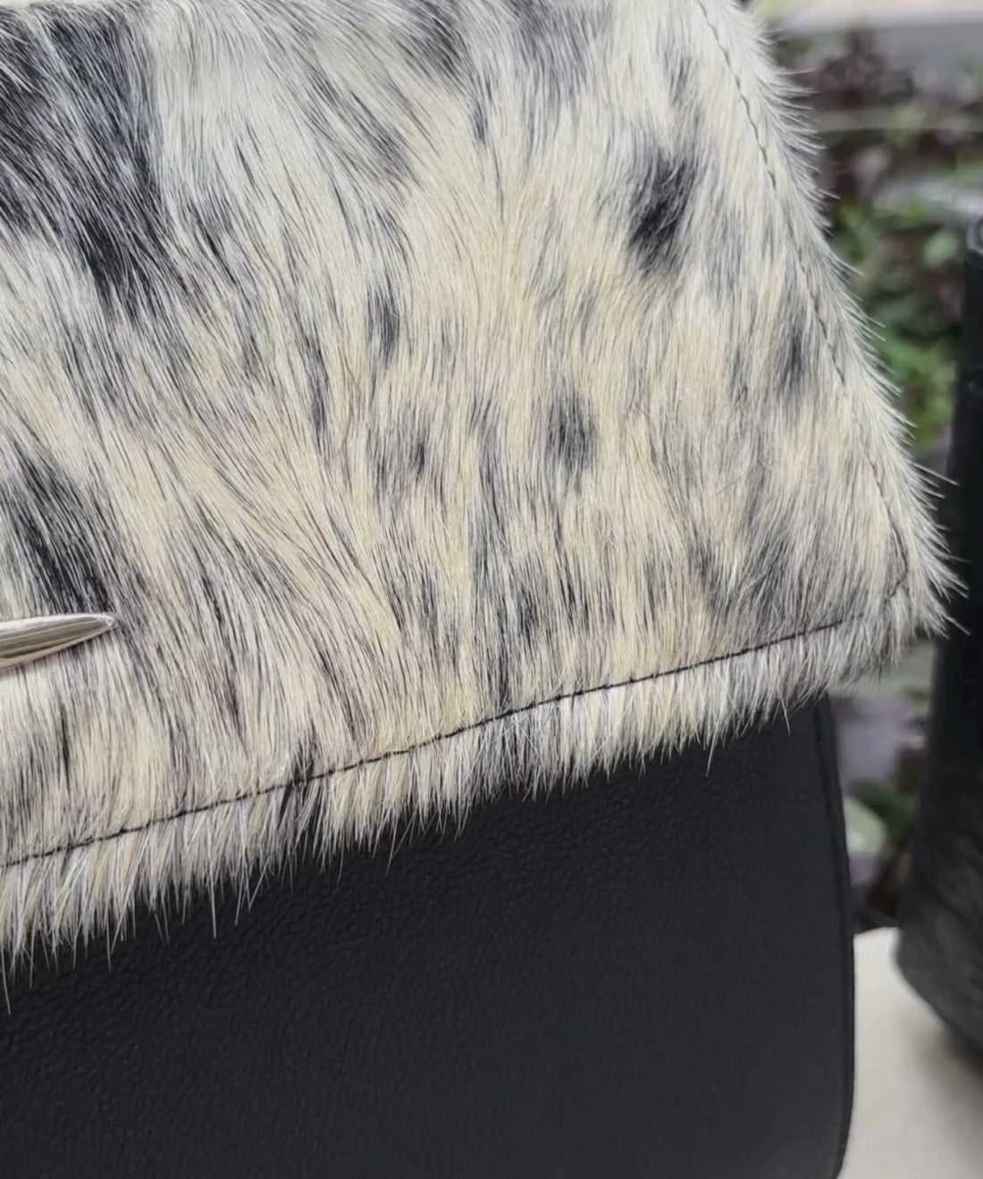 Audaz y sofisticado, elaborado en piel genuina con pelaje 100% natural. Un bolso que refleja personalidad fuerte y artesanal.