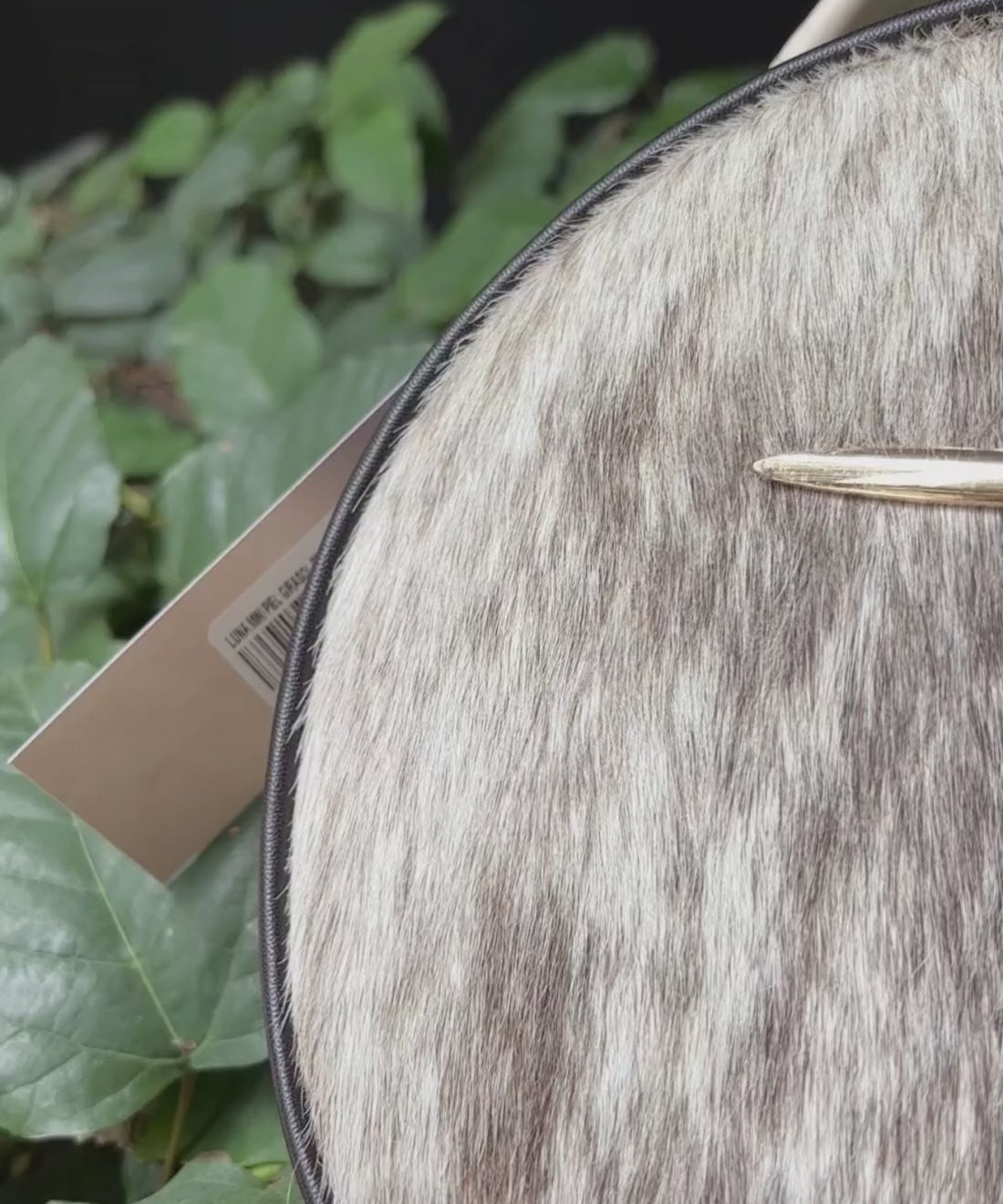 Su forma circular y piel genuina con pelaje 100% natural lo convierten en un bolso único. Una pieza atrevida que roba miradas.